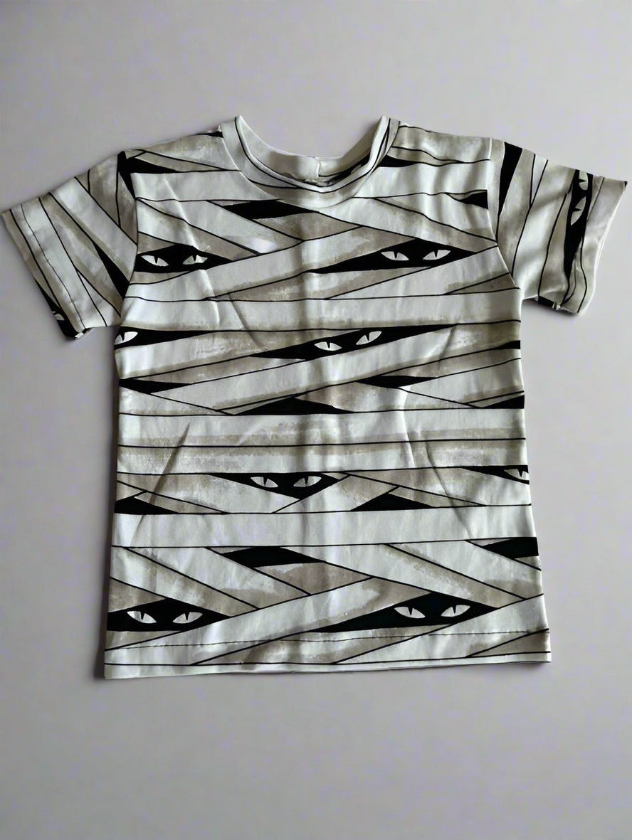 🦇 Spooky + Cool: Big, glowing mummy eyes peek out from the shadows, making this shirt the perfect mix of spooky and playful.