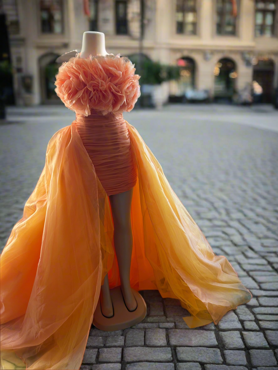 Expertly crafted with organza fabric, the Kimberly dress offers a chic two part design. Its pleated mini dress boasts a detachable 5 ft train made from tulle and organza, allowing for a customizable look. Available in your choice of color, this made-to-order dress is perfect for any special occasion.