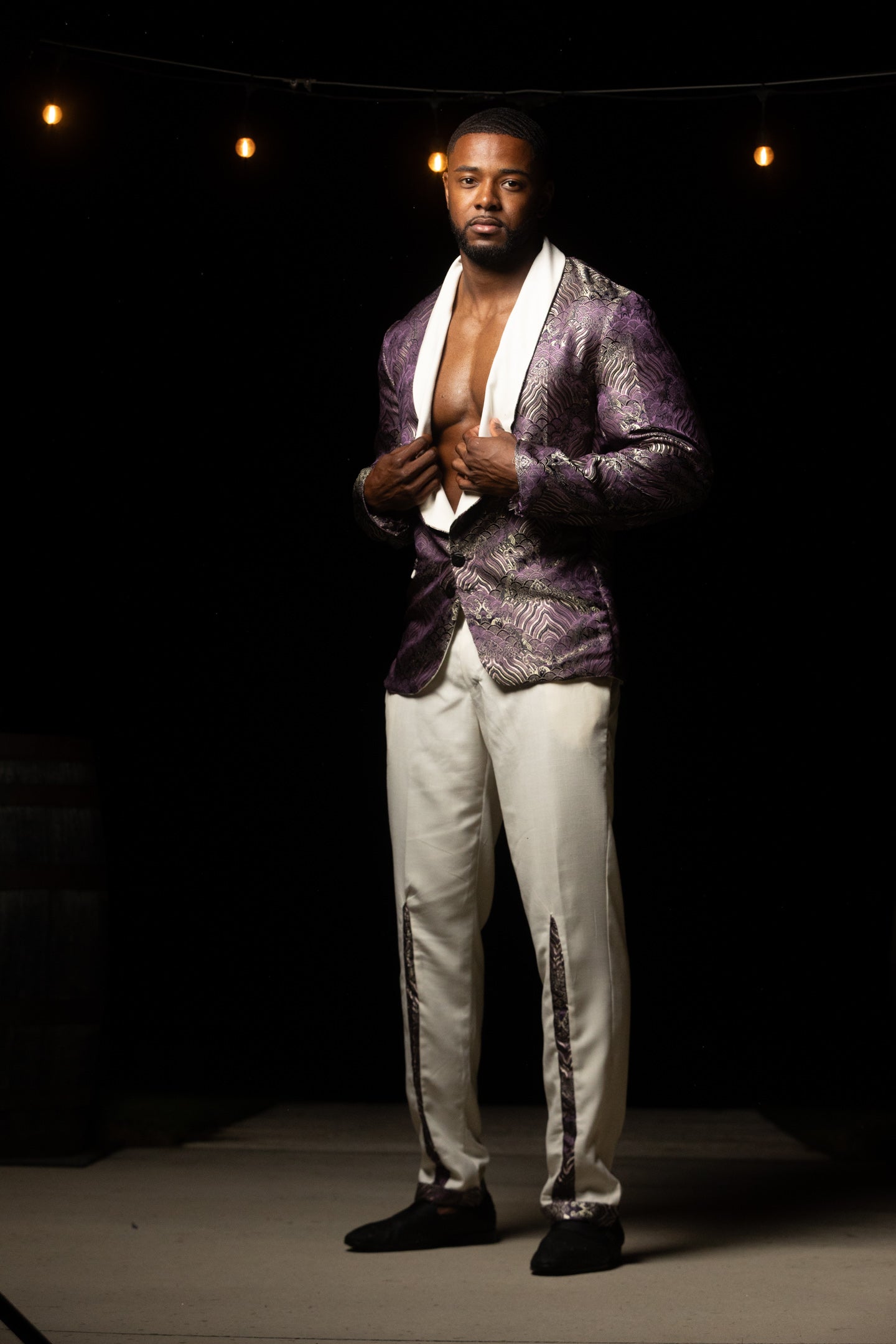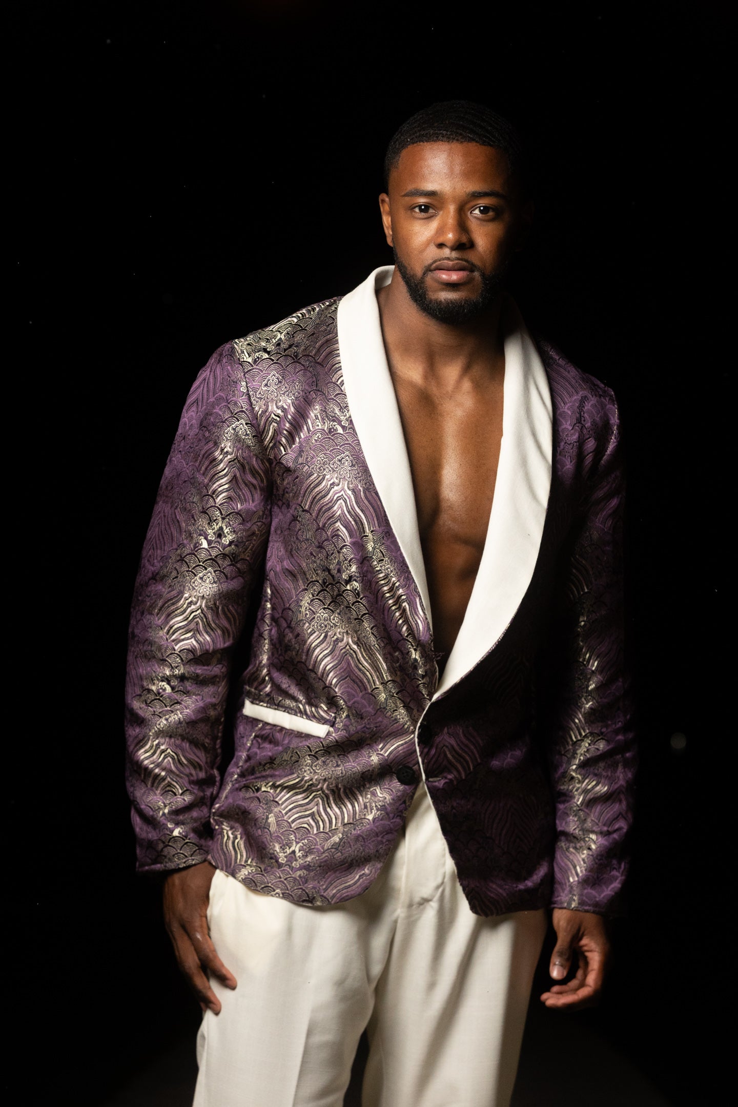 Introducing Mav our one-of-a-kind Men's Purple and Silver Brocade Suit Coat with Ivory Linen Lining and Matching Ivory Linen Pants – a distinguished ensemble that combines classic sophistication with a touch of modern flair. This exquisite suit is designed to make a statement at any formal event or special occasion.